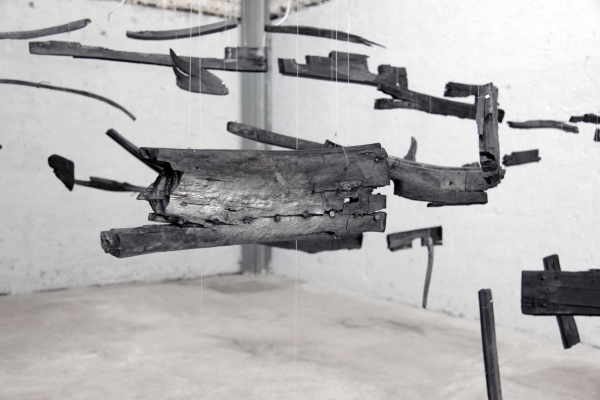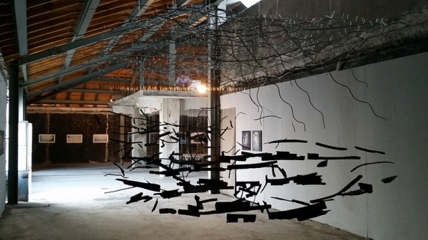 Spatial drawing made of driftwood charcoal, 4 × 7 × 5 m