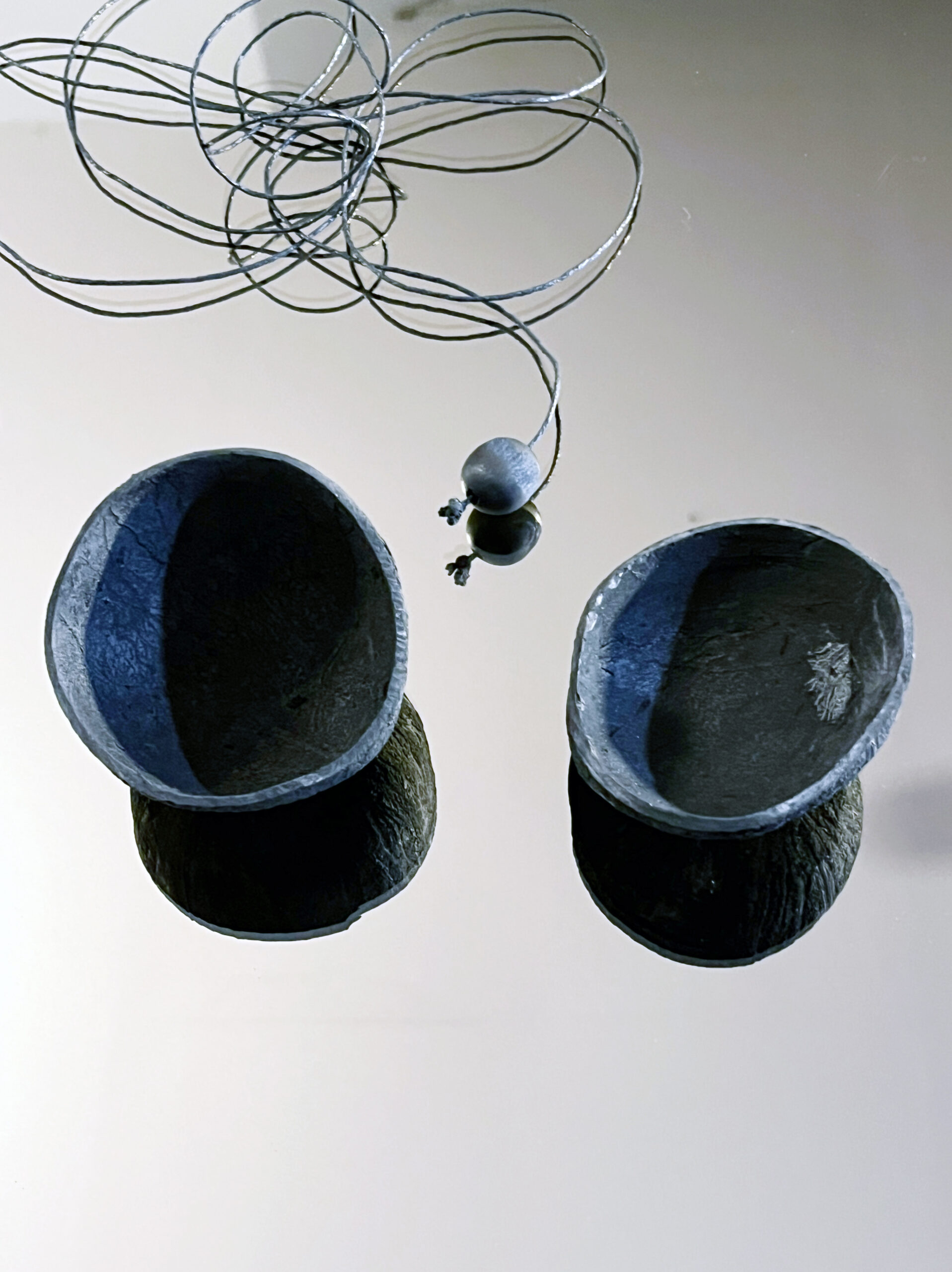 Two charred coconut halves – 7 × 7 × 5 cm and 7 × 7 × 4 cm – are carefully hollowed and carbonized so that each emits a clear, resonant tone when struck: C for the larger shell, E for the smaller. A small charcoal ball, suspended from a thread strikes the shells like delicate bells. The rhythmic swinging produces a simple, almost meditative two-tone interval. Beneath the installation, a square mirror (50 × 50 cm) reflects both the movement and the intricate patterns of charring, enhancing the work’s visual and auditory presence.