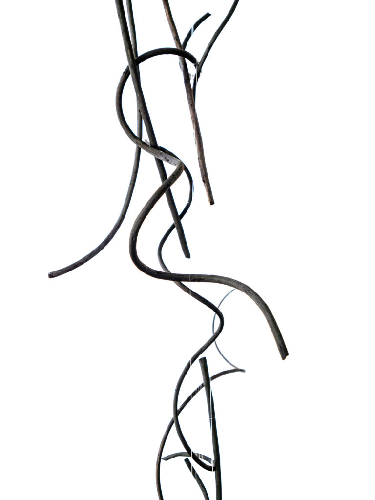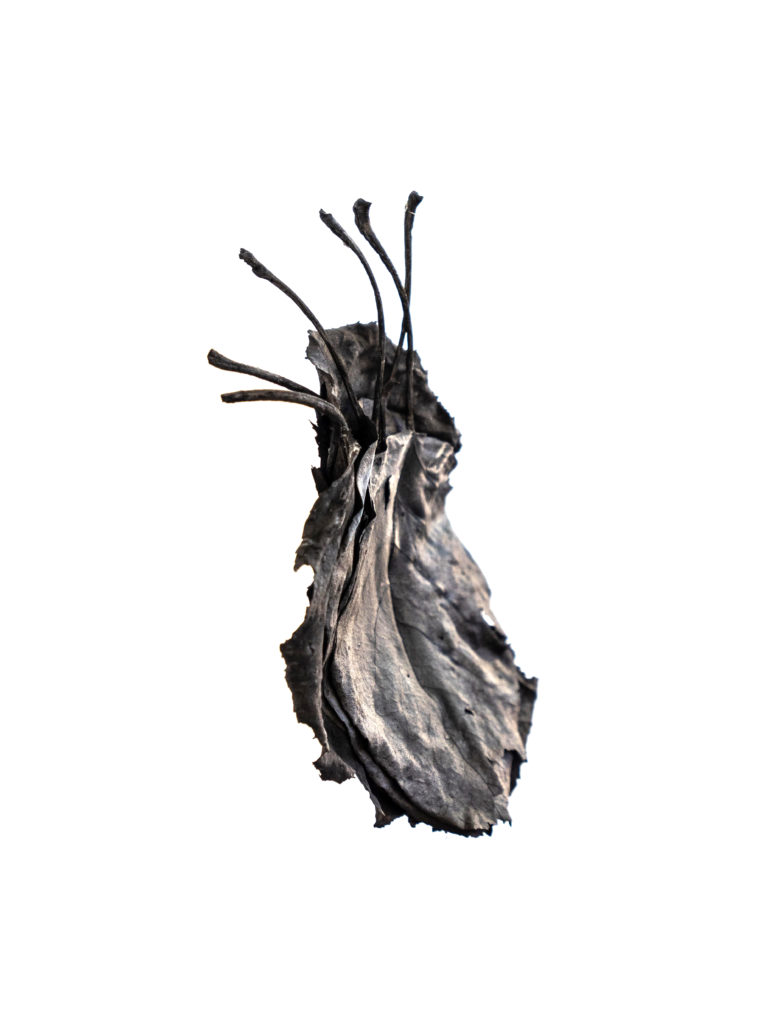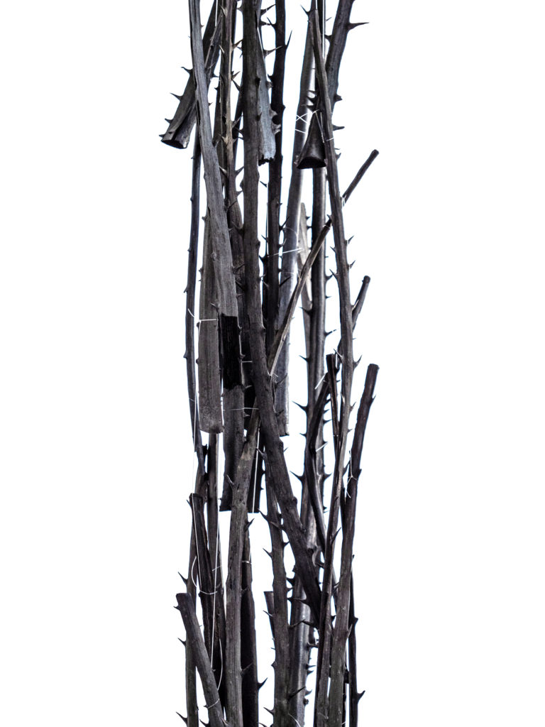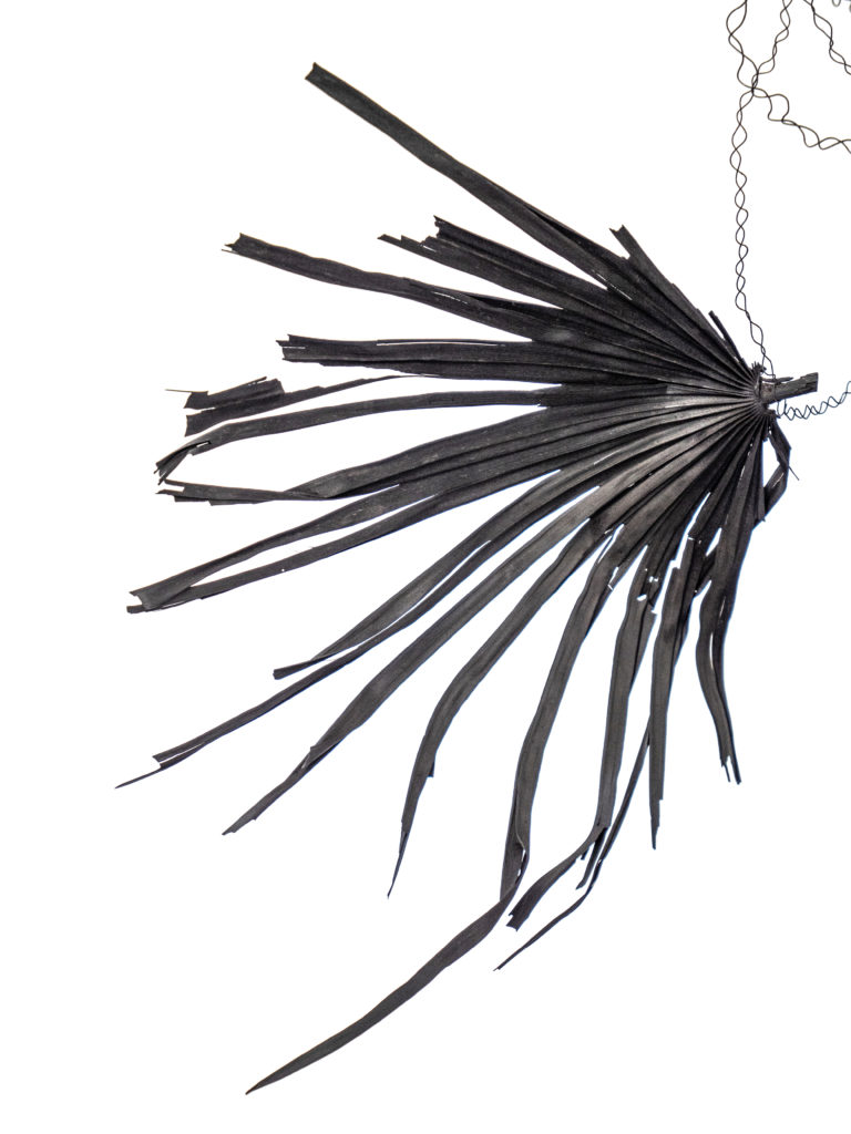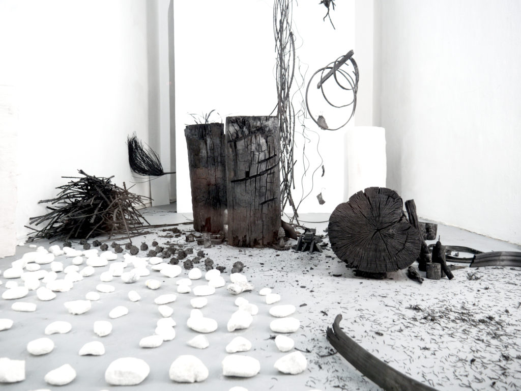 Made from Binchotan charcoal, carbonized beech logs, plaster, chalk, olive charcoal, palm charcoal, palm leaf charcoal, poplar leaf charcoal, black pine cone charcoal, various carbonized objects, holm oak charcoal, and fabric charcoal.
