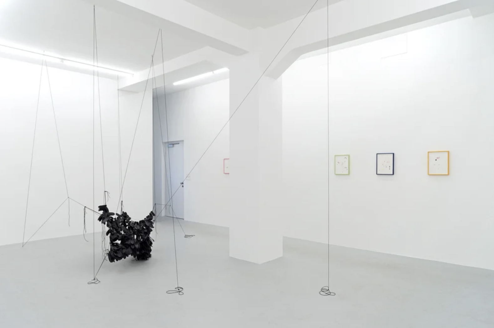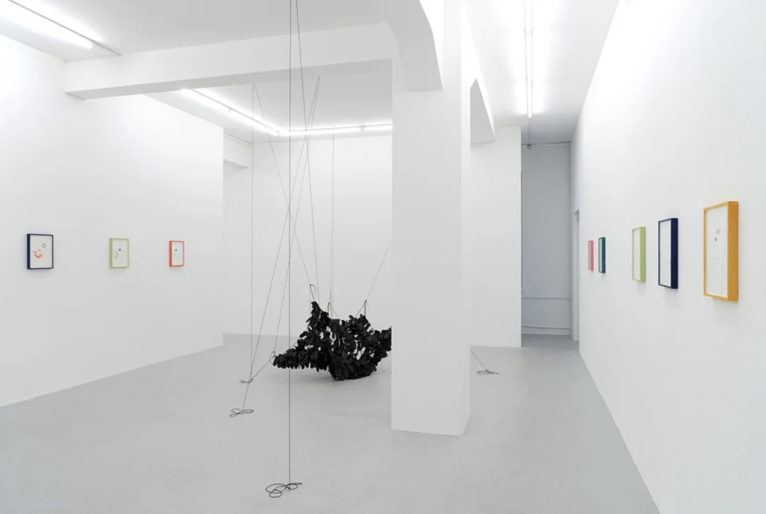 The arrangement now on display echoes this performance while also directly resulting from the current installation realized in the gallery. Furter’s drawings and Mohr’s installation complement each other perfectly: the colored remnants resonate with the carbonized shingles, while the fragility of both groups of works manifests in distinct ways.
