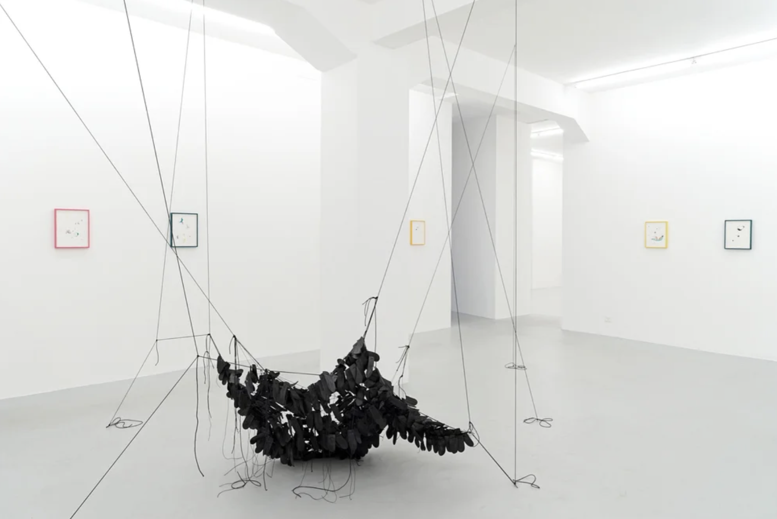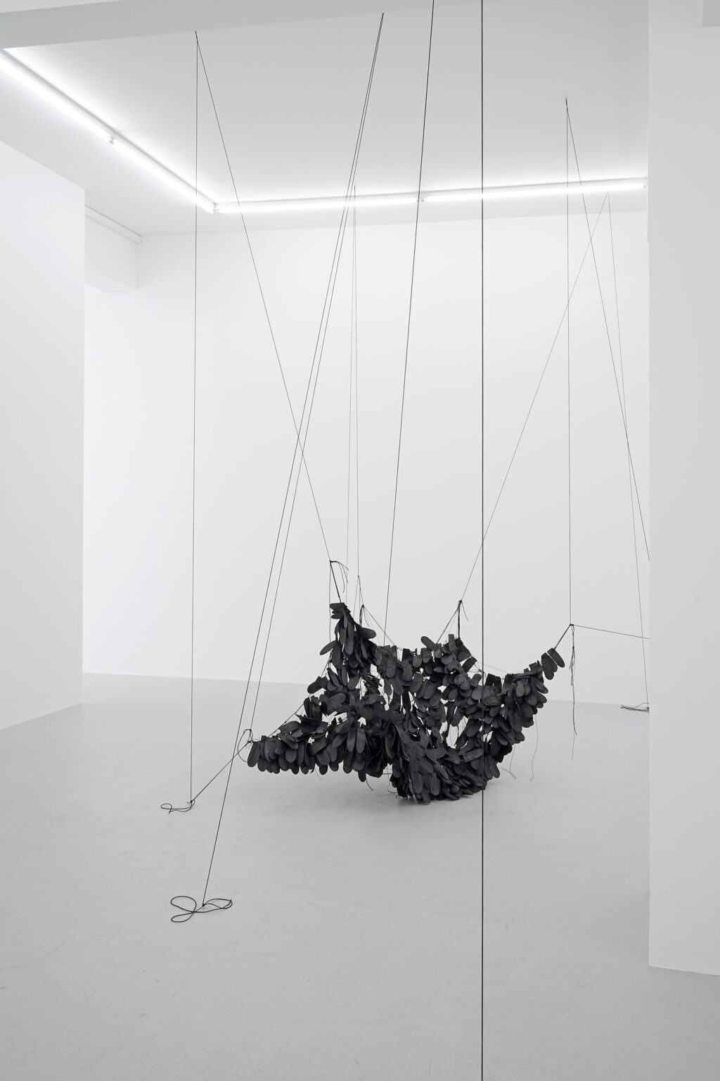 Within the group Remains of the Day, Ulrike Mohr’s installation-like black work Elevating Audrey Rose (2017) is presented. The piece is based on an arrangement of carbonized shingles distributed on a square surface and connected by cords. In a performative process, the charcoal drawing material became an extension of the dancer Audrey Rose Burden, who wore it like a dress—covering, protecting, and adorning her body. She manipulated the strings like a marionette’s puppeteer, giving the sculpture a new orientation.