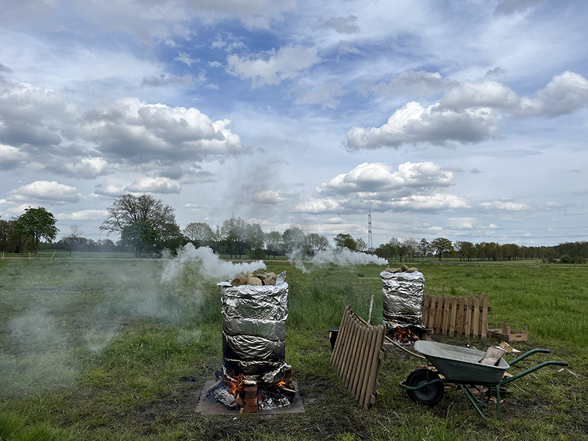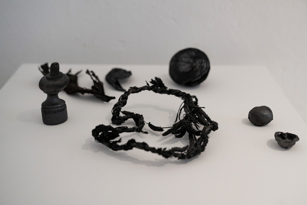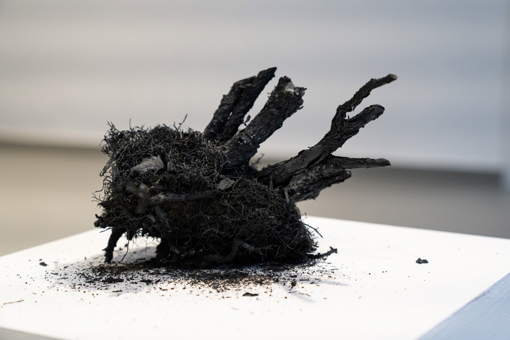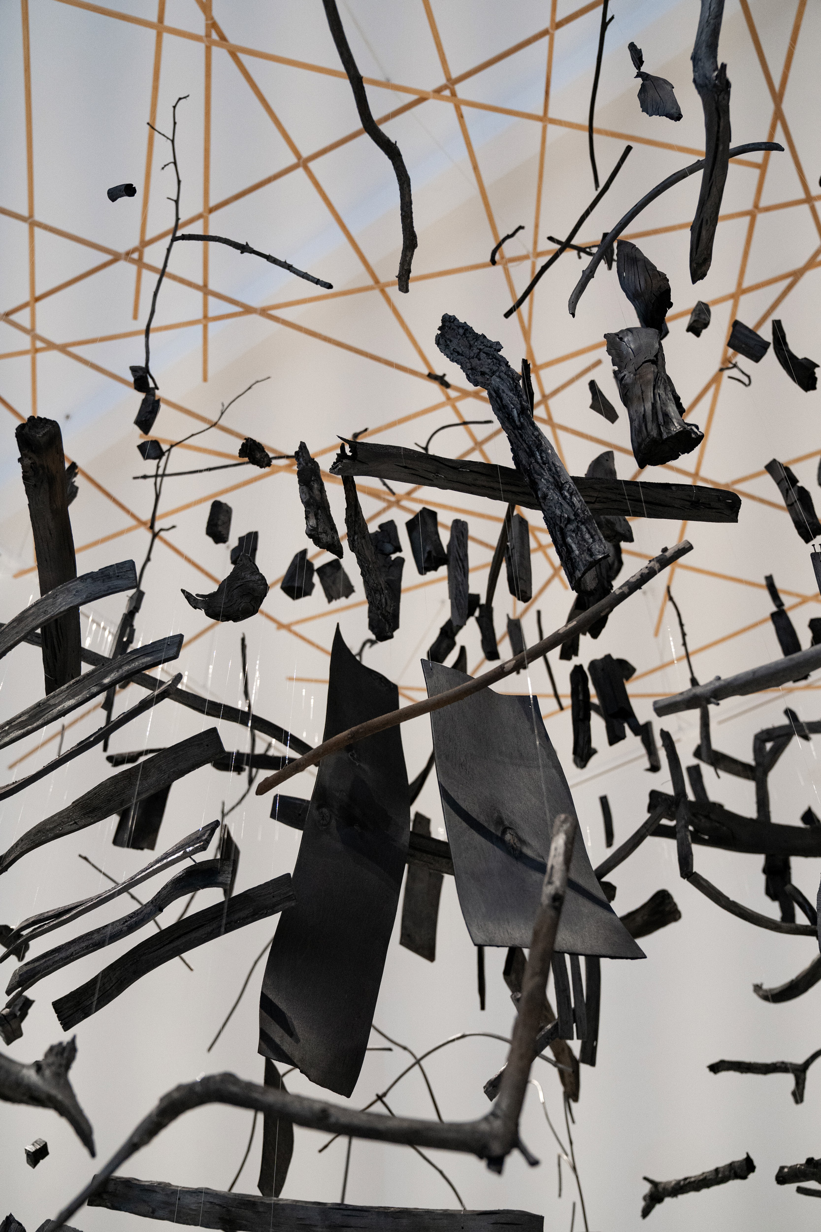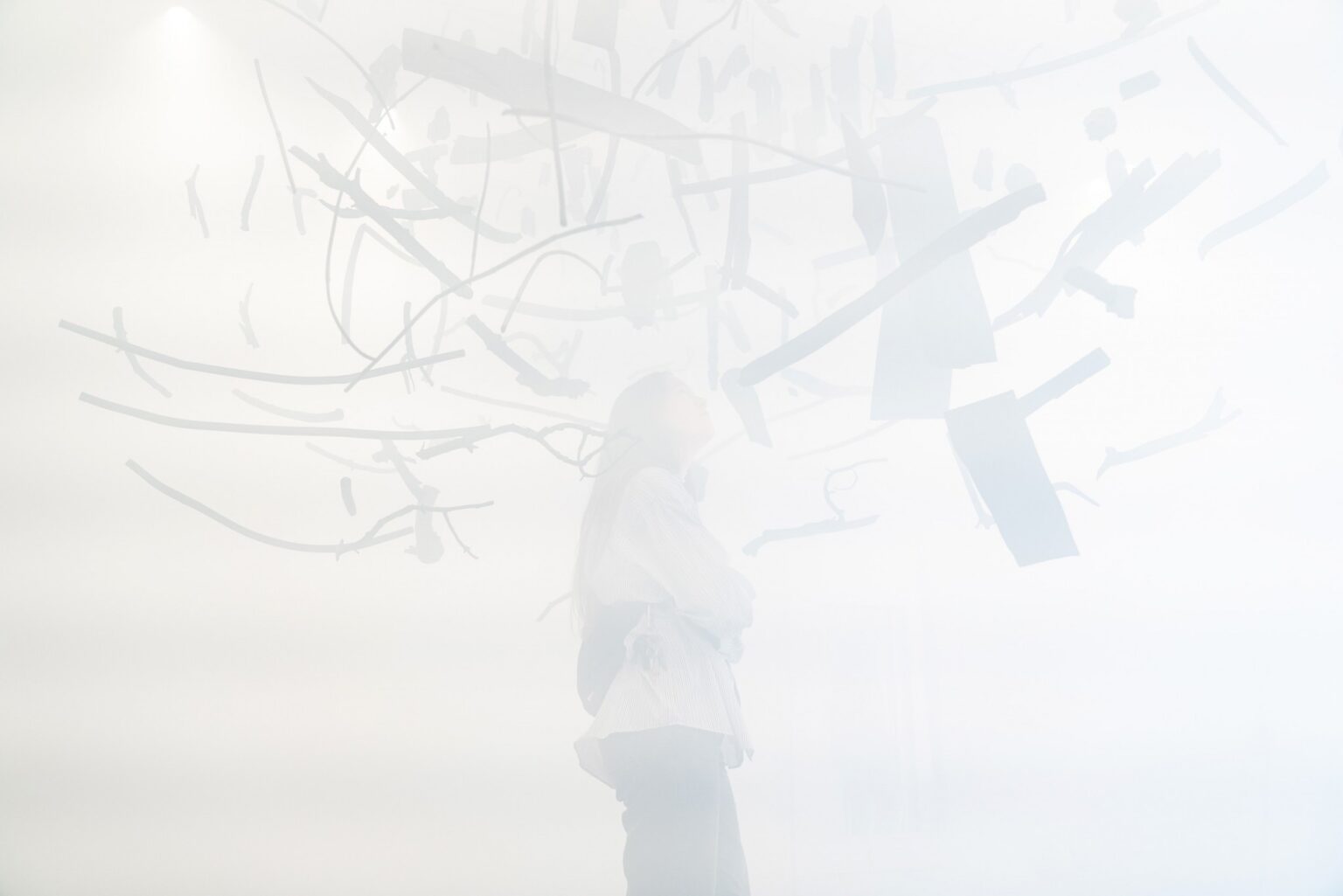 Ulrike Mohr works at the intersection of drawing, space, time, and charcoal. In her installation LICHTUNG, charred wood is condensed into a floating form suspended in space and enveloped in mist. This recurring mist repeatedly dissolves, revealing the spatial drawing beneath. The wood used was collected from residents in and around Lüneburg. Members of the Kunstverein collaborated with the artist to char the wood.