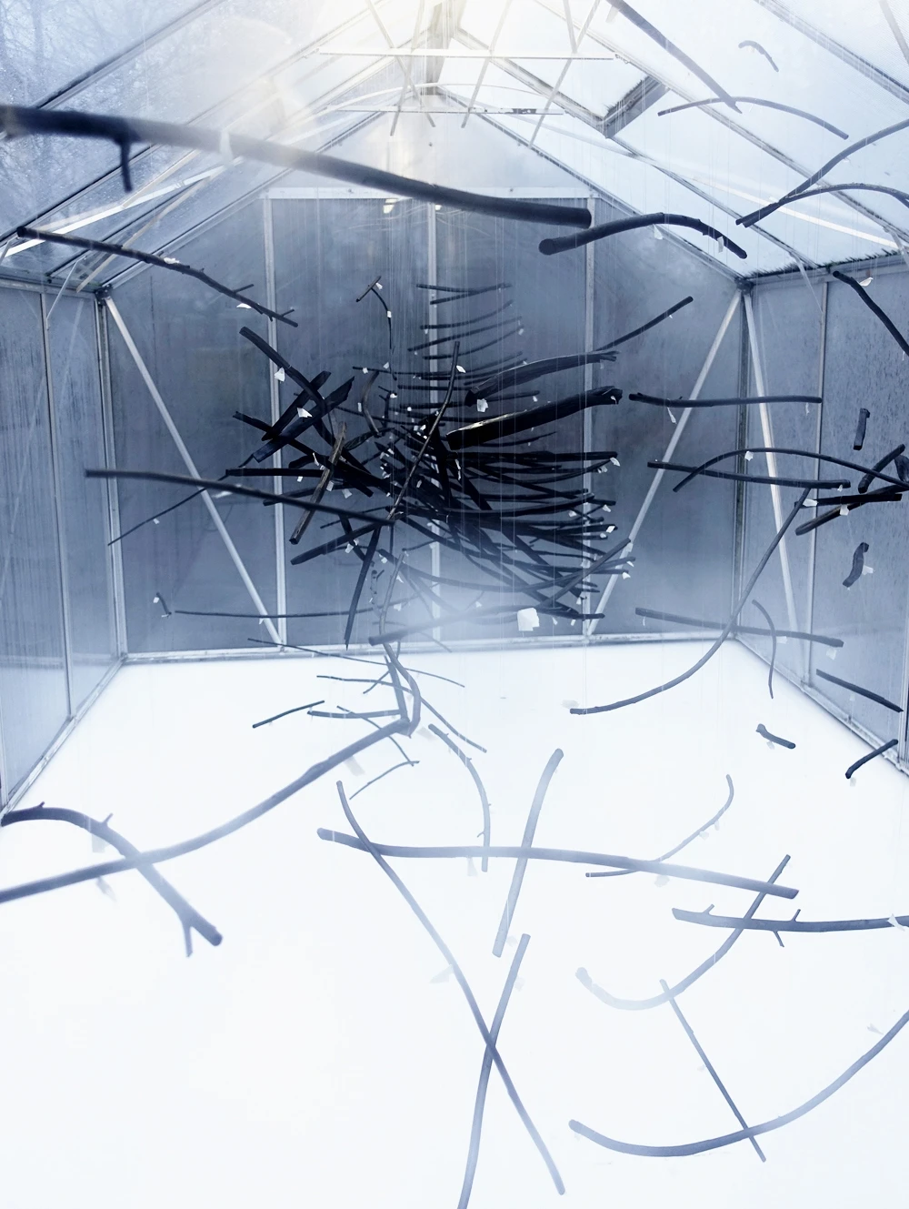The starting point for Ulrike Mohr’s work is not only the material of charcoal, but also its place of origin, the context in which it is formed, and the temporal dimension of its production process. In her spatial drawings, charred branches from abandoned allotment gardens, fragmented trees, or carbonized driftwood from the sea appear to float in space. Condensed into swarm-like formations, these fragile branches hang freely, tracing a black, geometric path of charcoal through the room—chaotic and directed at once. Through the process of carbonization, the branches have lost their original color, yet the details of their surface remain intact, permanently preserved. The viewer’s physical movement around and immersion into the spatial depth of the work enables an experience of its complexity, lightness, and identity. Ulrike Mohr increasingly dissolves the boundaries between material, space, time, and sound, creating new realms of interpretation and perception.