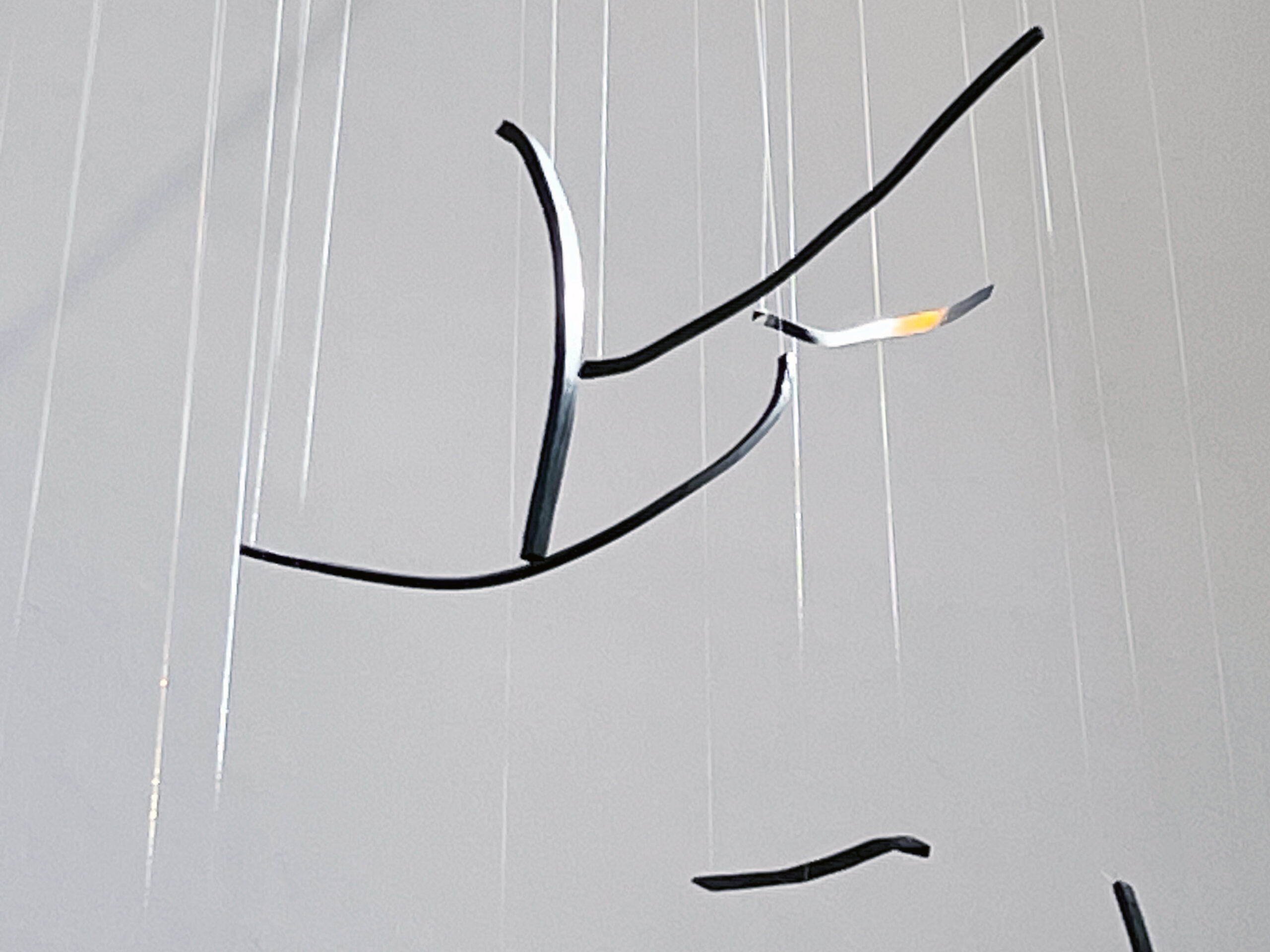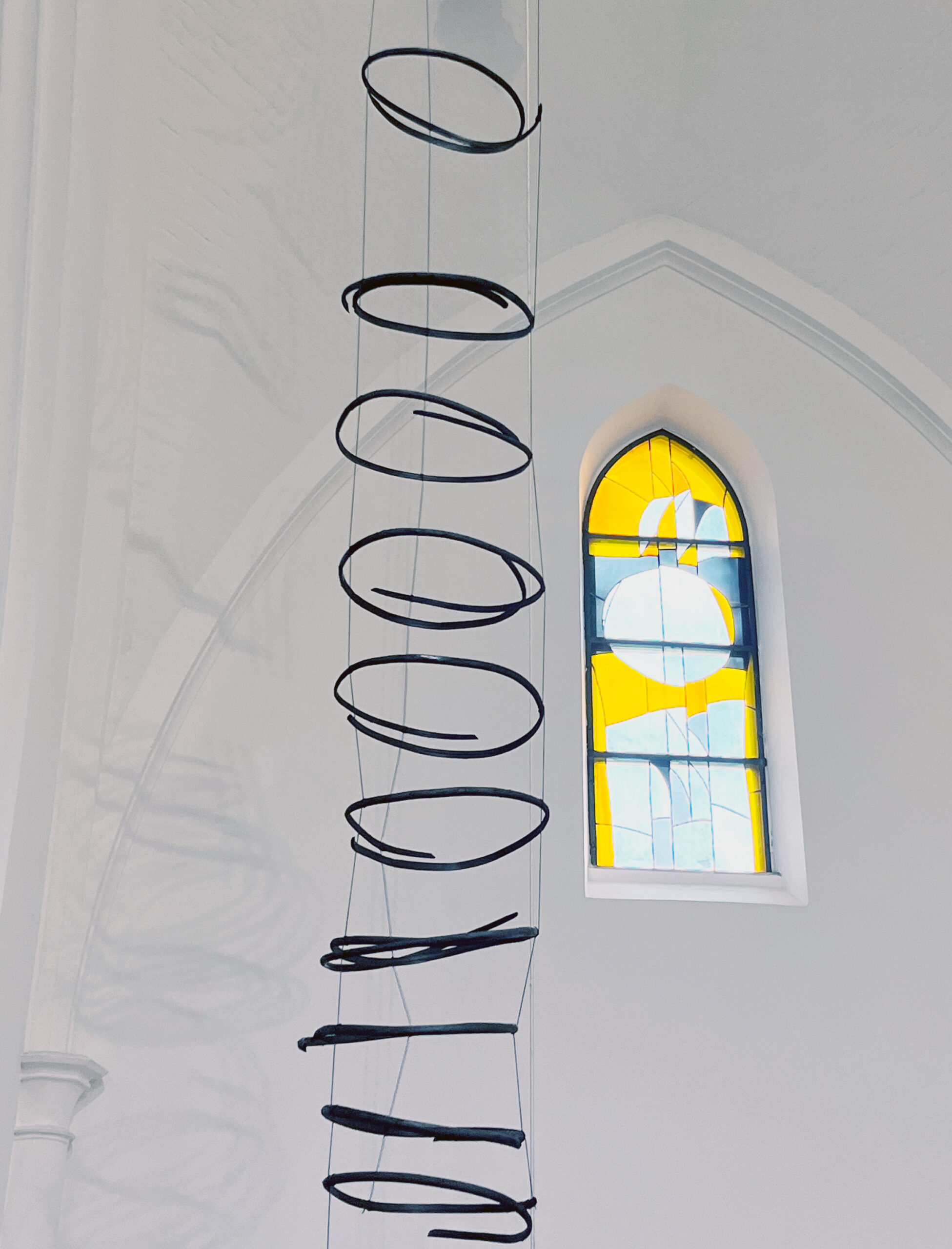Alongside it, an installation of charred willow rings extends over ten meters. Each ring, 70 cm in diameter, is knotted to the next and suspended in rhythm. Slowly rotating around their own axes, the rings generate a quiet, spiral-like motion — a fragile architecture of repetition, resistance, and continuous transformation – referencing the colorful church windows by Hubert Distler representing the sun (1960).