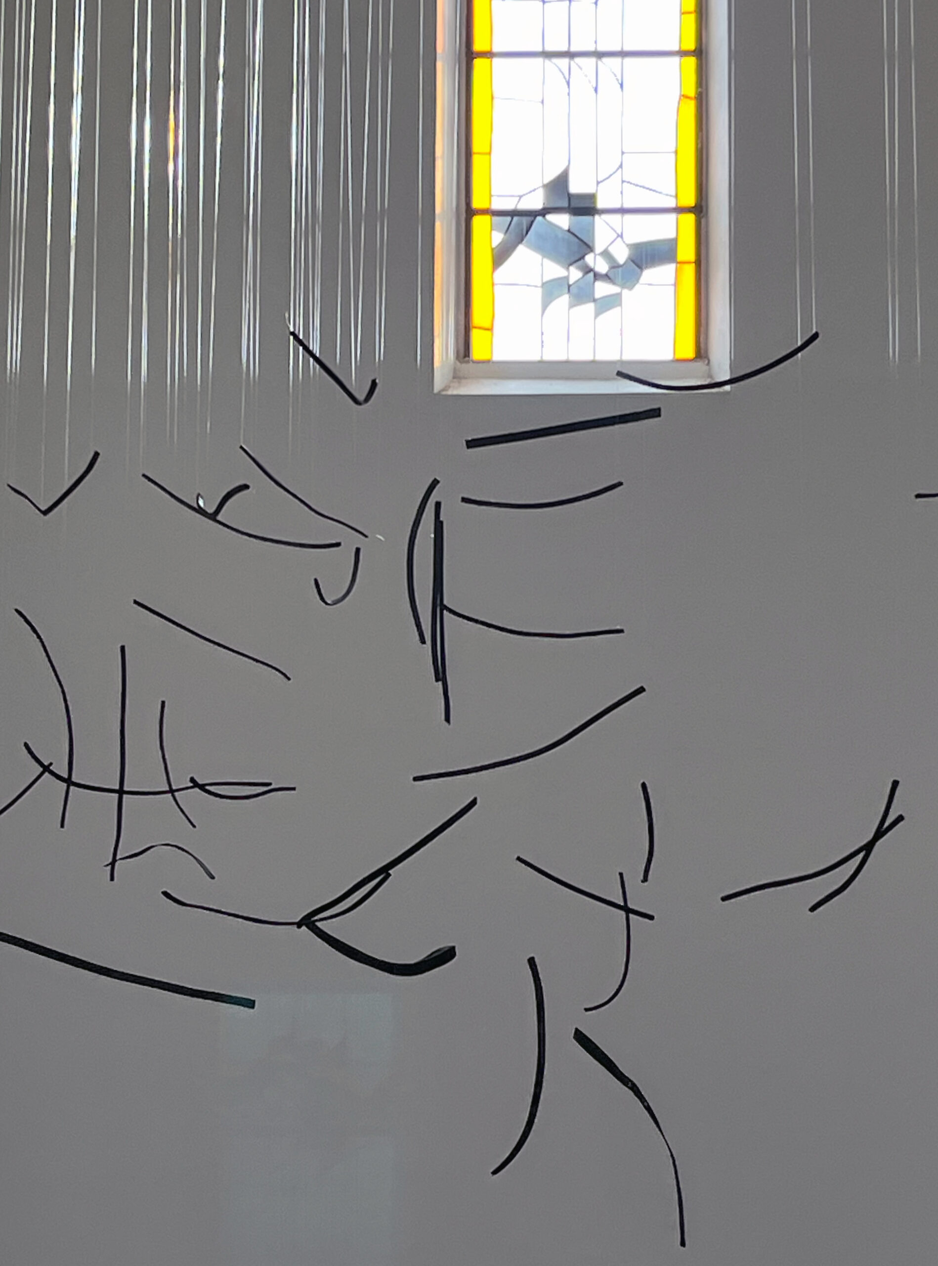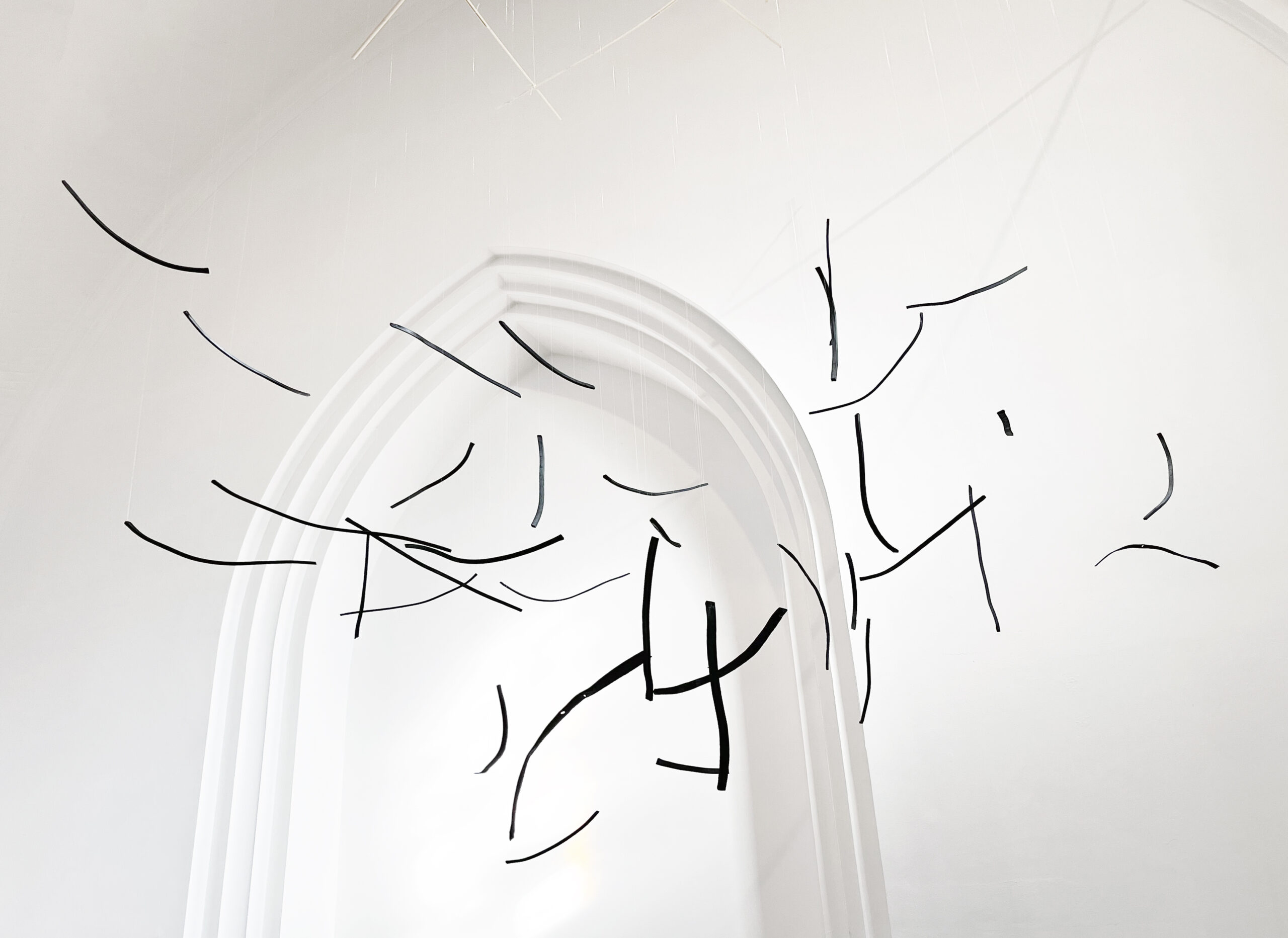 A 15-meter drawing made with charcoal, suspended high above through the church ceiling, spans the space in vertiginous height — a spatial gesture in its purest form, referencing the colorful church windows by Hubert Distler representing the earth (1960).