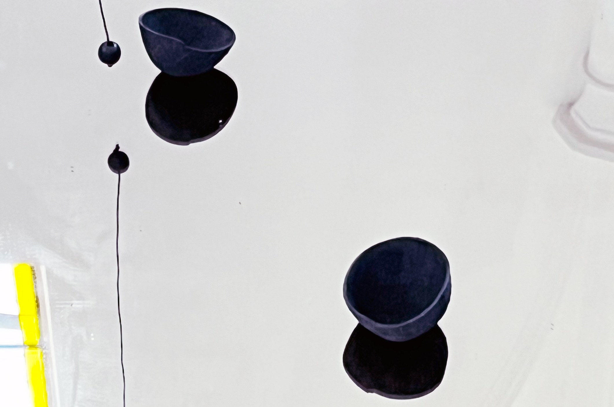 On the floor at the center of the space, a sound sculpture: a bell-like instrument composed of charred coconuts. A single motor sets a blackened sphere in motion, striking the coconuts one by one. Their resonant tones echo through the space — like signals from the outside world, a ritual, a meditation.